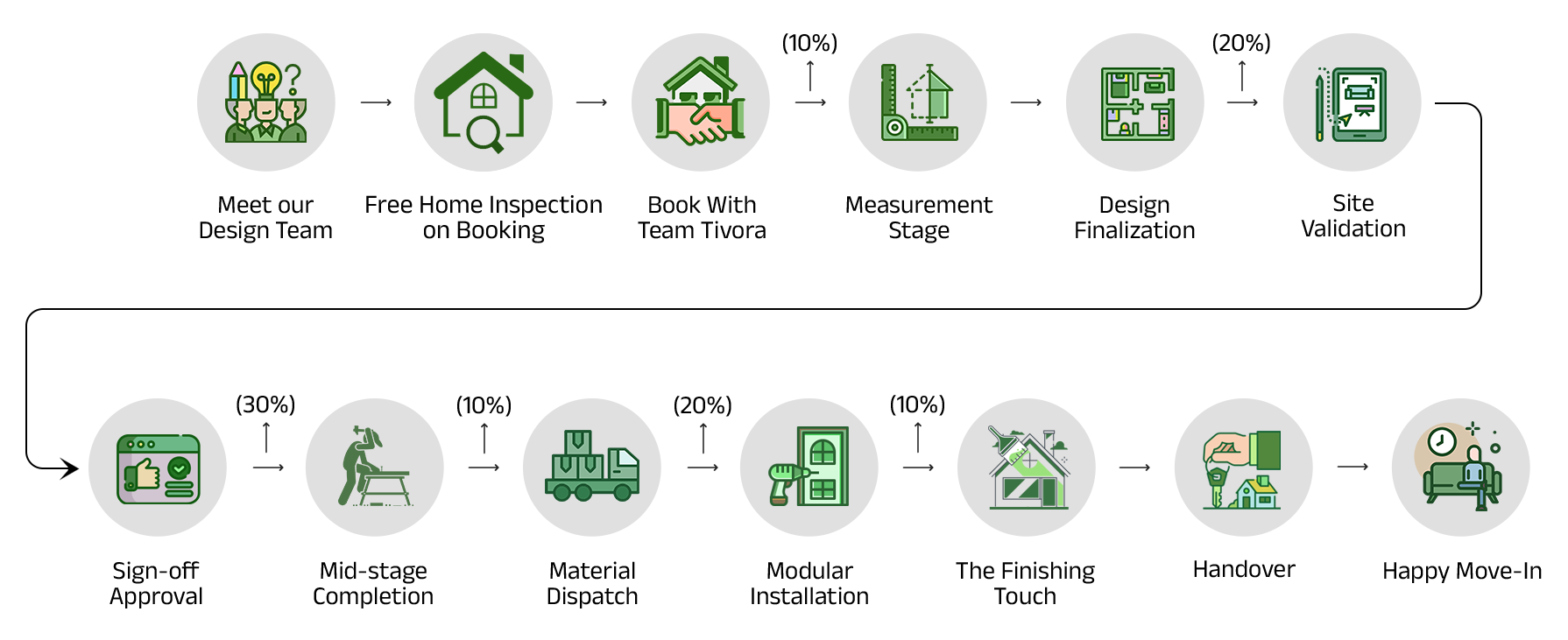 • We inform you when your materials are ready to be sent to your home. At this stage, the custom carpentry work, civil work and onsite services are almost completed. The modular furniture is 100% produced at the factory, yet to be installed. 20% payment is required before dispatch. Once you make the balance payment, we’ll head to the last leg of your project- Installation and Finishing.